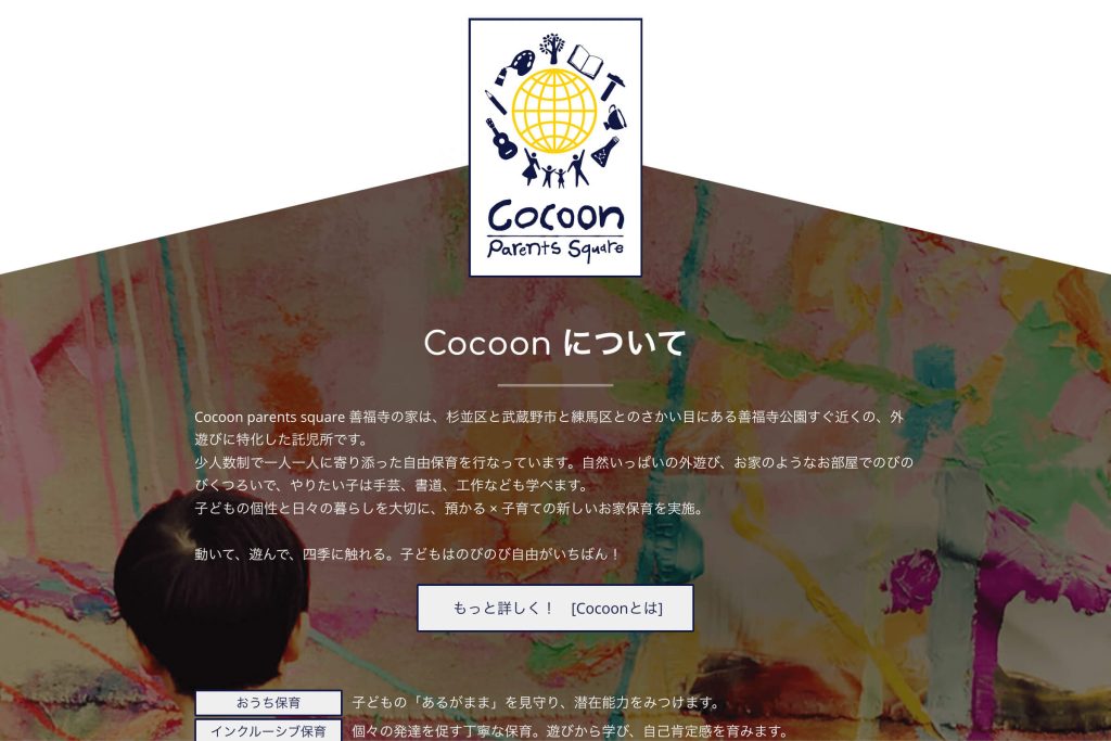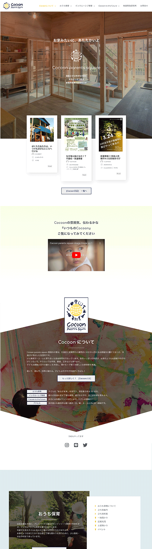 杉並区善福寺にある託児所のWebサイトです。自然いっぱいの外遊び、お家で過ごすような暖かさ、インクルーシブ保育にも力をいれ、質が高く個性的な保育を行なっているという魅力を、より良い保育を求めている保護者の方へ伝わるようにディレクション、デザインをしました。現地を拝見し、子どもがいきいきとしている様子の魅力が伝わるキャッチコピーも考案しました。